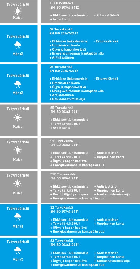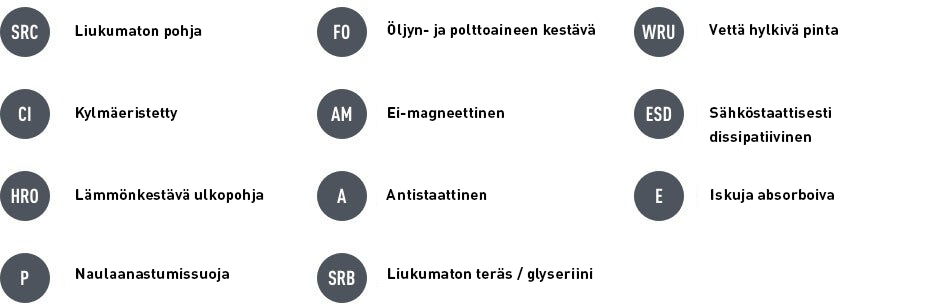 Näiden lisästandardien avulla voit räätälöidä turvakenkäsi sopimaan täydellisesti työympäristöösi.