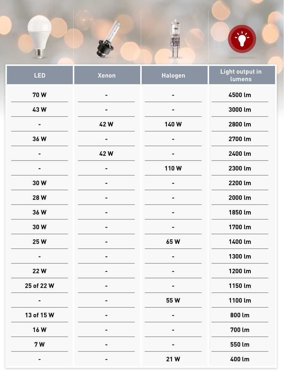 Watteja on lähes mahdotonta muuntaa lumeneiksi, koska kyse on kahdesta eri yksiköstä. Aiemmin oli niin, että tietyn valomäärän tuottamiseen tarvittiin korkeampi wattiluku. Nykyään näin ei enää ole – myös alhaisen wattiluvun lamput voivat tuottaa paljon valoa. Lumenarvo on suhteutettava wattimäärään, joka tarvitaan halutun kirkkauden saavuttamiseksi. Koska LED-lamput tarvitsevat huomattavasti vähemmän virtaa, myös ajoneuvo kuluttaa vähemmän virtaa valaistukseen, mikä on suuri etu. Tämä vähentää muun muassa laturin kuormitusta.