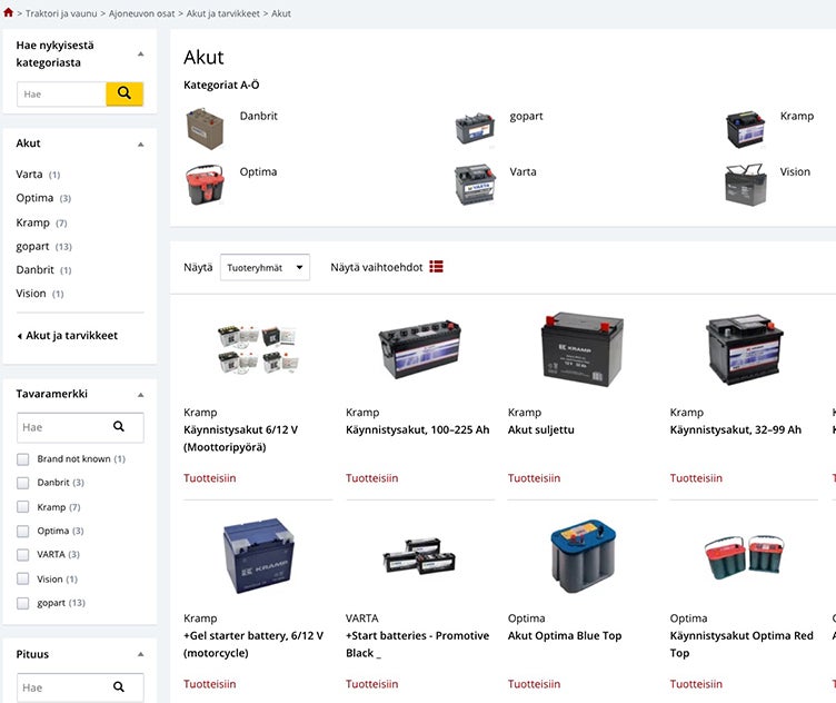 Voit käyttää näitä suodattimia helposti siirtymällä verkkokaupassa akkujen sivulle, esimerkiksi yläosan punaisen palkin Traktorit ja vaunu -valikosta löytyvän Akut ja tarvikkeet linkin kautta.