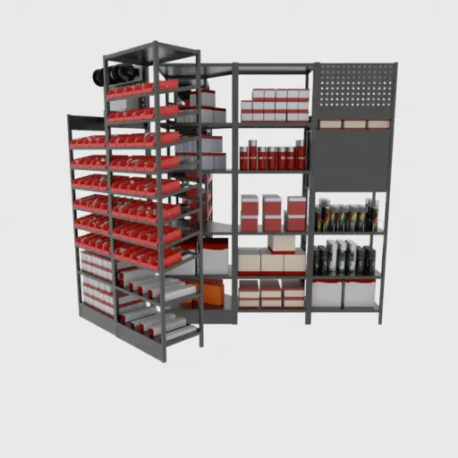 -> Tablettes droites optimisant le rangement des produits tels que des cartouches, peinture et aérosols techniques.