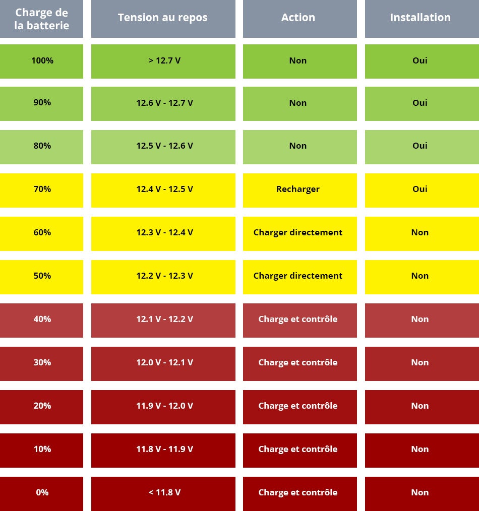 Pour vous assurer que vos batteries fonctionneront correctement lorsque vous en aurez besoin, il est conseillé de les vérifier avec un testeur de batterie tous les trois mois. Le résultat est inférieur à 12,5 V ? Dans ce cas, il est important que vous chargiez la batterie complètement. Vous trouverez plus d'informations sur les testeurs de batterie disponibles chez Kramp ici. Le tableau ci-dessous montre ce qu’il faut faire avec les batteries dans votre entrepôt dans une situation donnée.