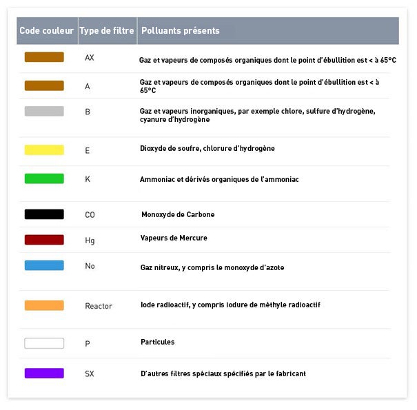 Le tableau suivant indique le code couleur des filtres selon la norme EN14387 - cela vous aide à déterminer quel type de filtre est nécessaire pour la substance dangereuse à laquelle vous avez affaire.