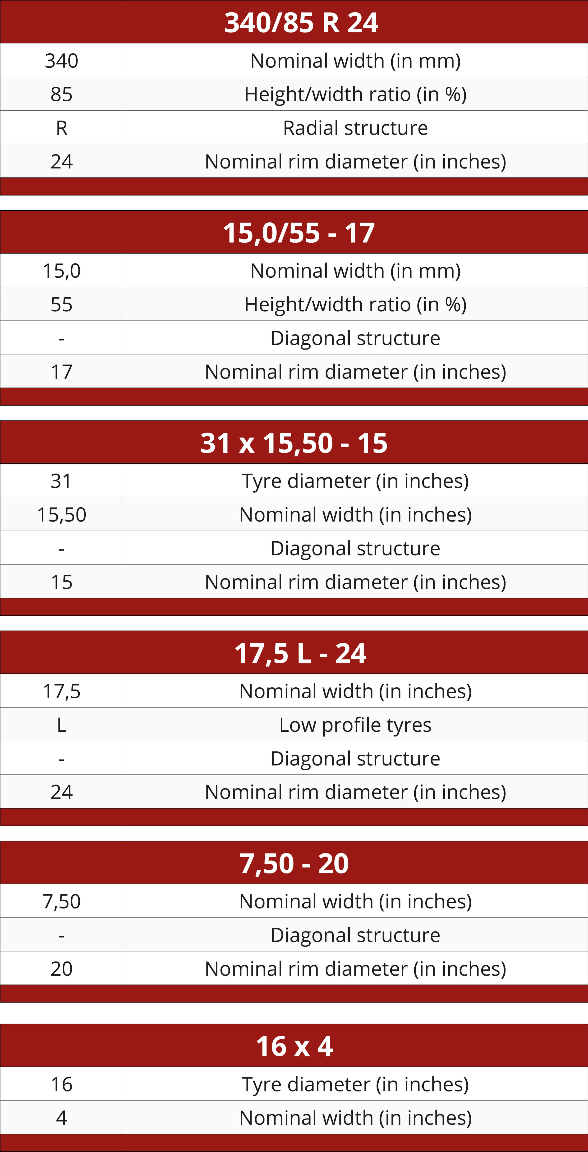 This last example is almost the same as the previous one. However, it also shows the diameter of the rim and the hyphen indicates that it is a diagonal tyre. The size of the tyre in this example is 31x25.4 = 790mm diameter. The width is 15.5x25.4 = 395mm and the rim is 15 inches. In the metric size indication this would be a 395/50-15 tyre.