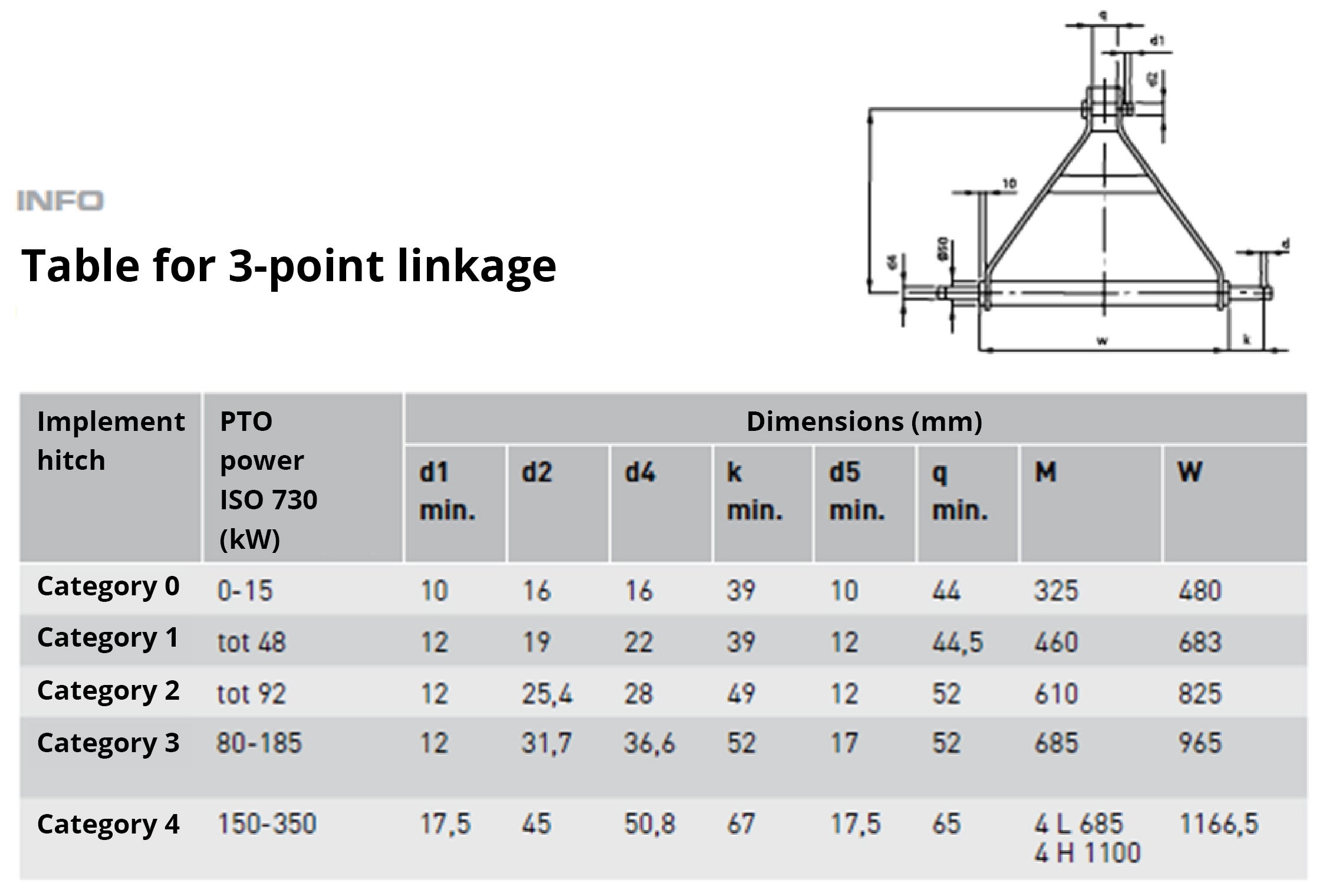 There are five three-point hitch size categories. Which one suits your purposes depends on the power of your tractor. The higher the category, the sturdier the link arms and top link, and the thicker the pins. This allows them to withstand greater force.