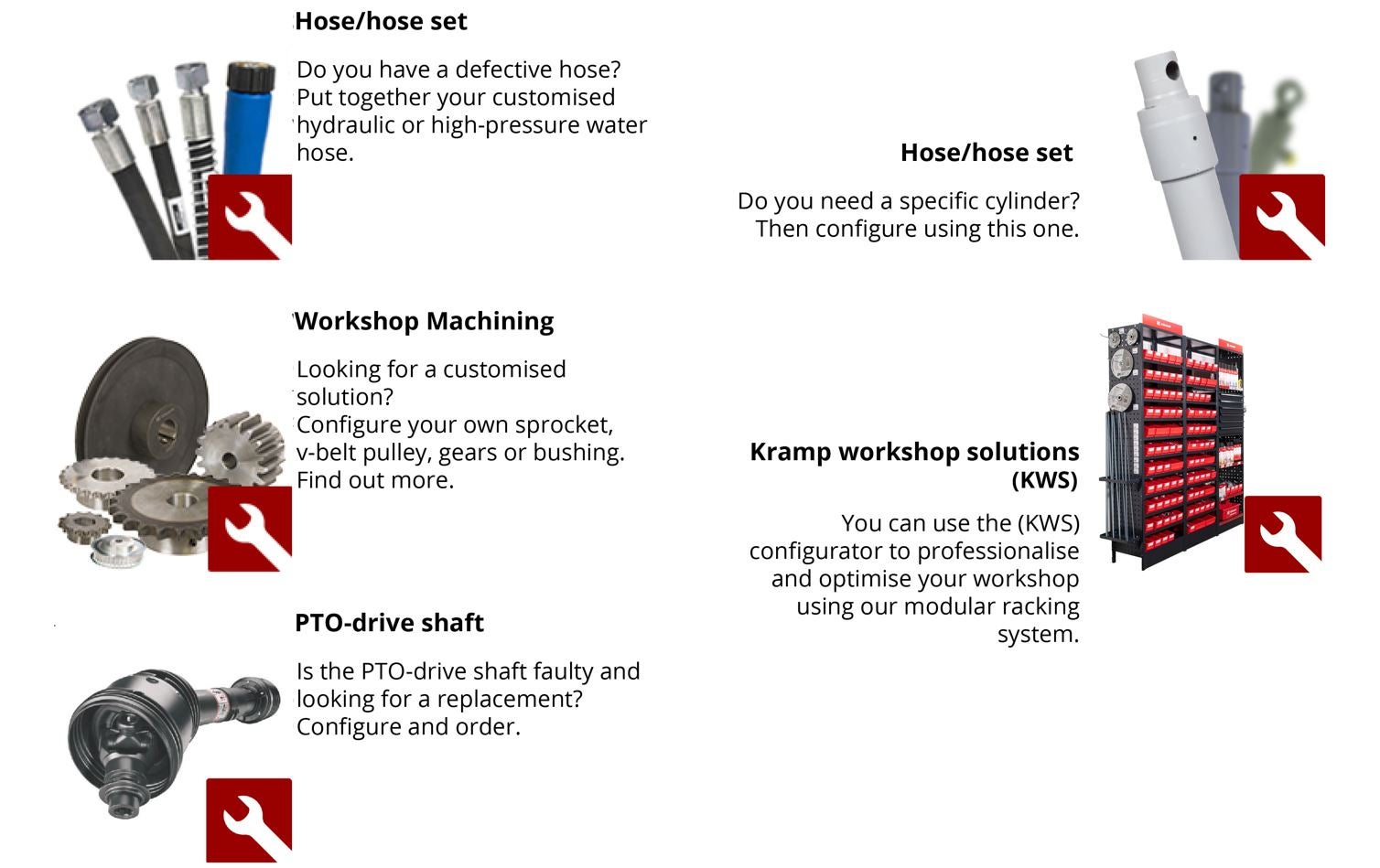 To use the online configurator, it is important to first log into the webshop. You will then be given automatic access. There is a link to the "Kramp Product Configurator" at the bottom of the Kramp homepage.