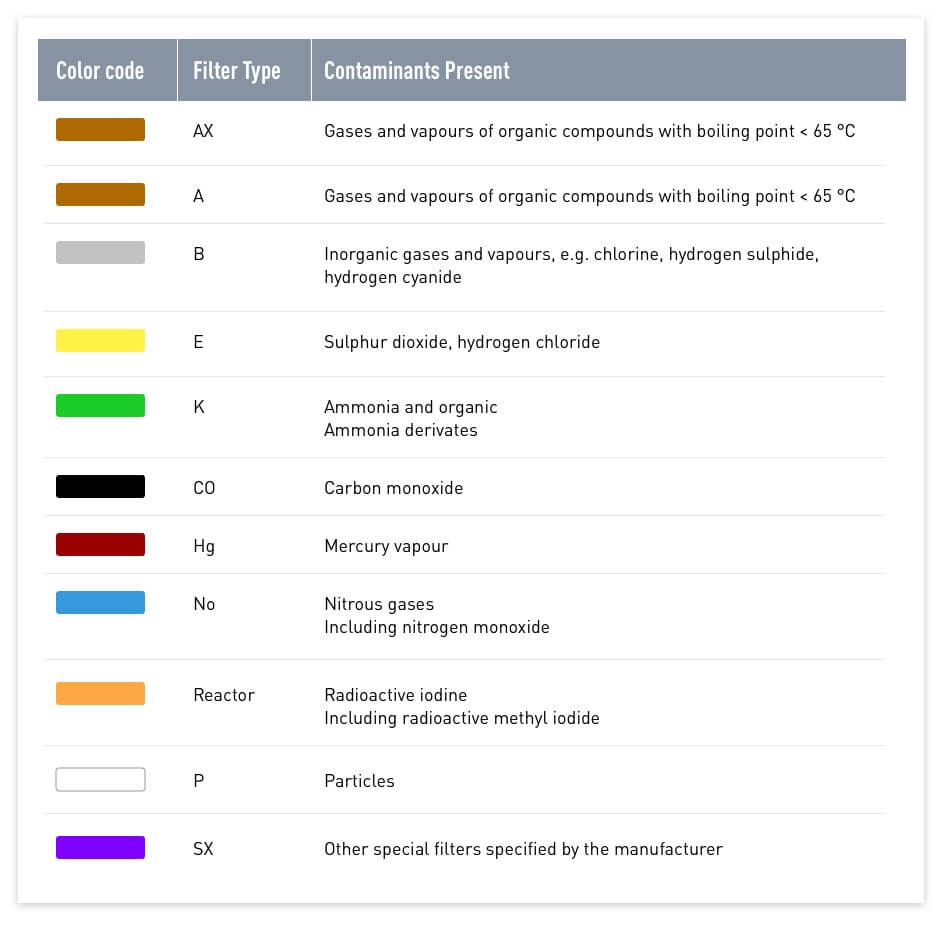 The following table shows the colour coding of the filters according to EN14387 - this helps you to determine what type of filter is required for the hazardous substance you are dealing with.
