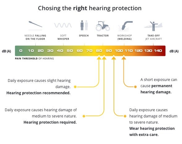 • The noise level: the louder the noise, the greater the risk of hearing damage