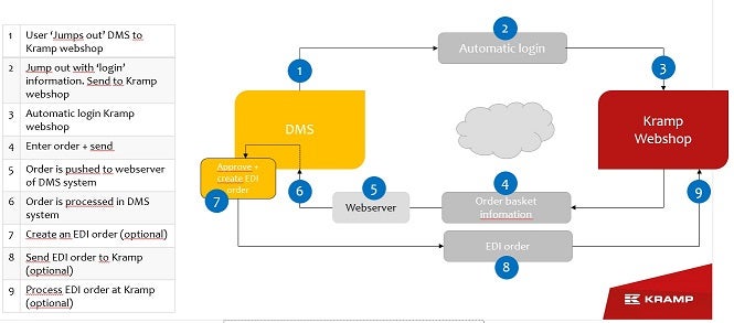 As you handle many ordering, bookkeeping and administration processes in your own Dealer Management System (DMS), it would make sense to also use your Dealer Management System to order directly at Kramp.