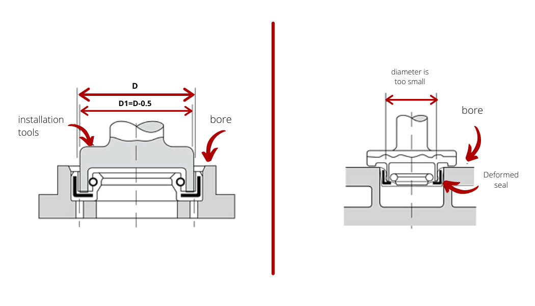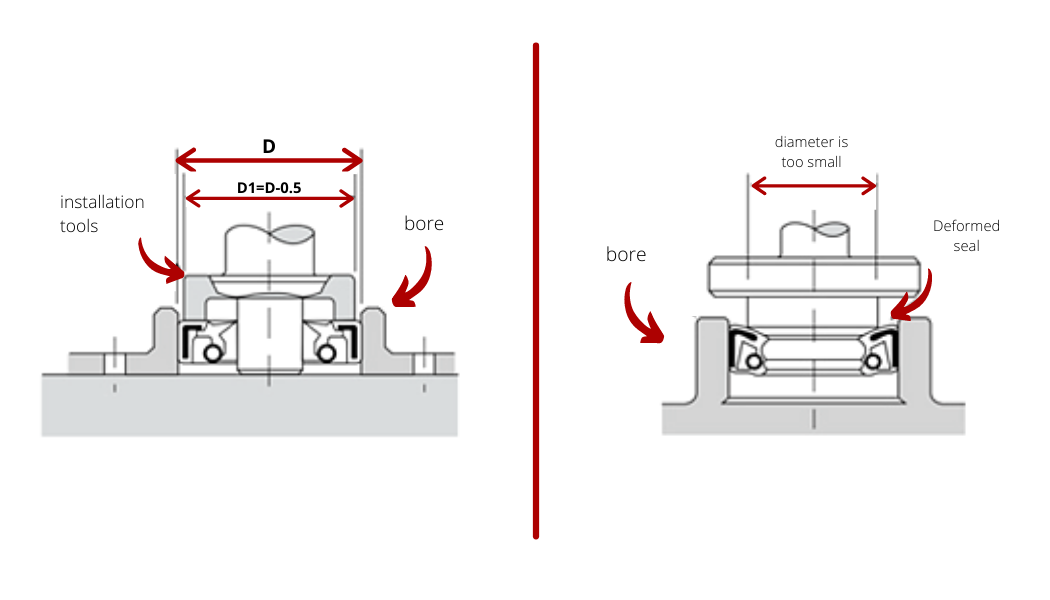 Reason: Inner diameter of the bore is larger than the outer diameter of the oil seal. The oil seal is displaced axially due to the overpressure it creates.