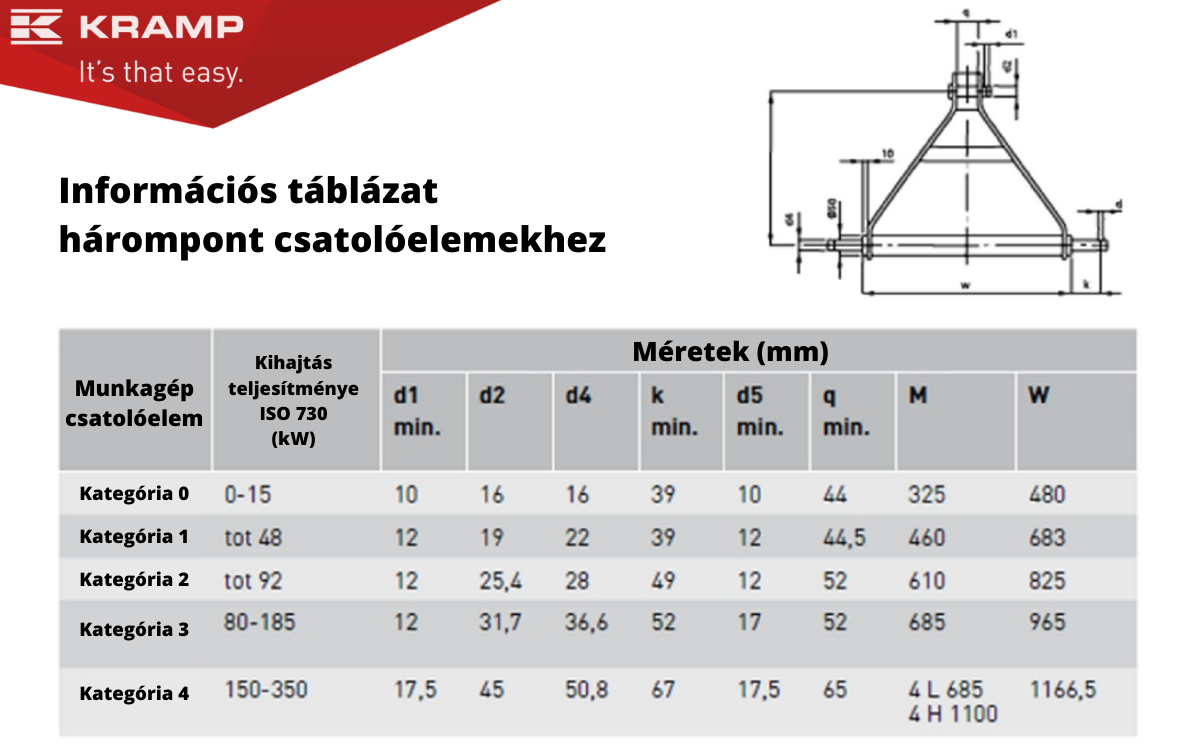 Az alábbi táblázat segít a helyes döntés meghozatalában a hárompont csatolók méreteinél: