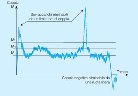 Ogni macchina opera con una coppia di lavoro standard (identificata come M nel grafico sottostante). Durante il normale funzionamento, questa coppia oscilla naturalmente (M1), ma in determinate condizioni può superare i limiti di sicurezza. È proprio in questi momenti critici che entra in azione il limitatore di coppia (Mt), progettato specificatamente per assorbire i sovraccarichi e preservare l'integrità dei componenti.
