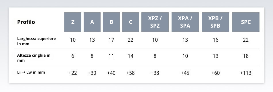 Per le cinghie trapezoidali si utilizzano diverse misure di lunghezza: