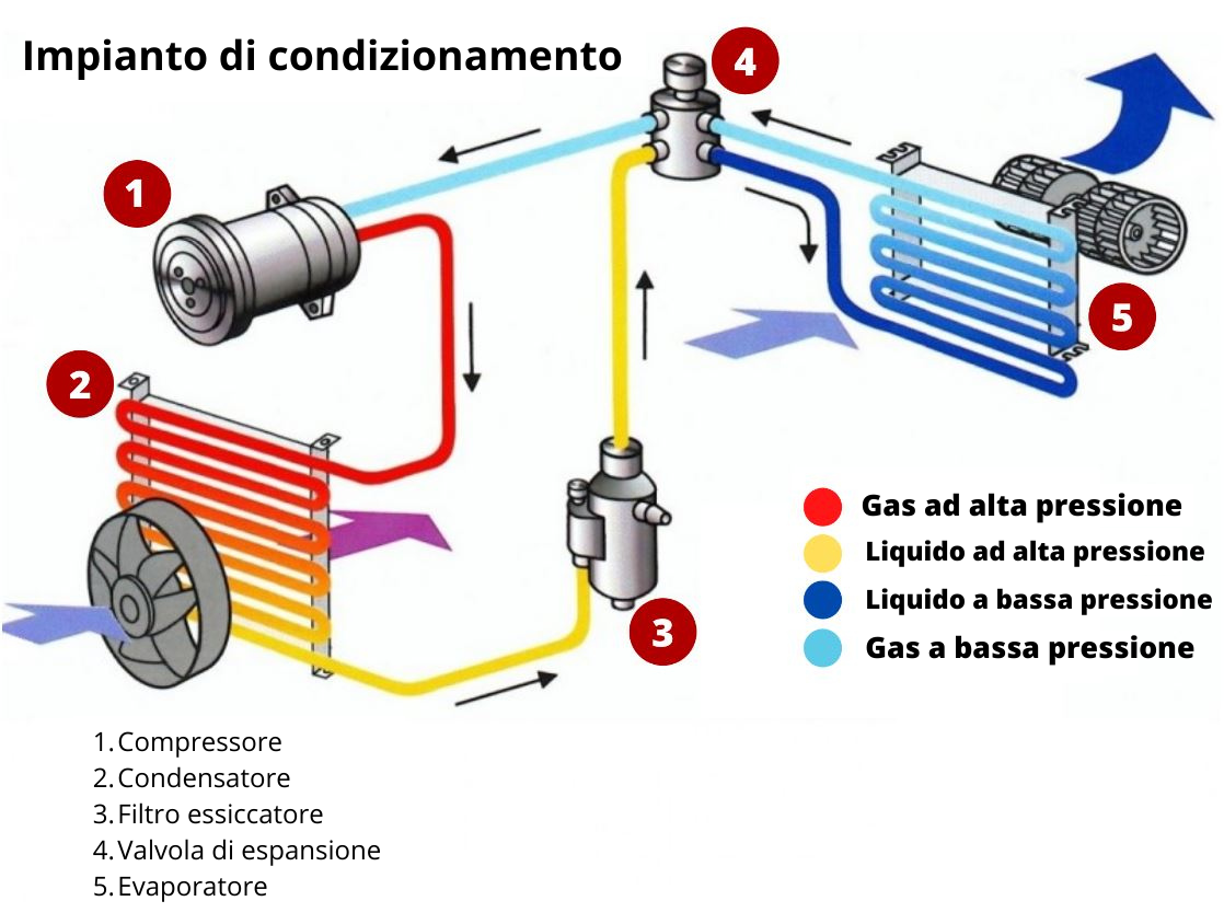 In primo luogo, viene estratto calore dall'ambiente. L'evaporatore è situato vicino alla valvola di espansione, che garantisce l'estrazione del calore dall'evaporatore. Questo calore è necessario per consentire al refrigerante liquido di evaporare, trasformandosi in gas. L'aria si raffredda e viene messa in circolo dall'unità di condizionamento o dalle ventole dell'abitacolo del veicolo. Il refrigerante gassoso ritorna al compressore per un nuovo ciclo.