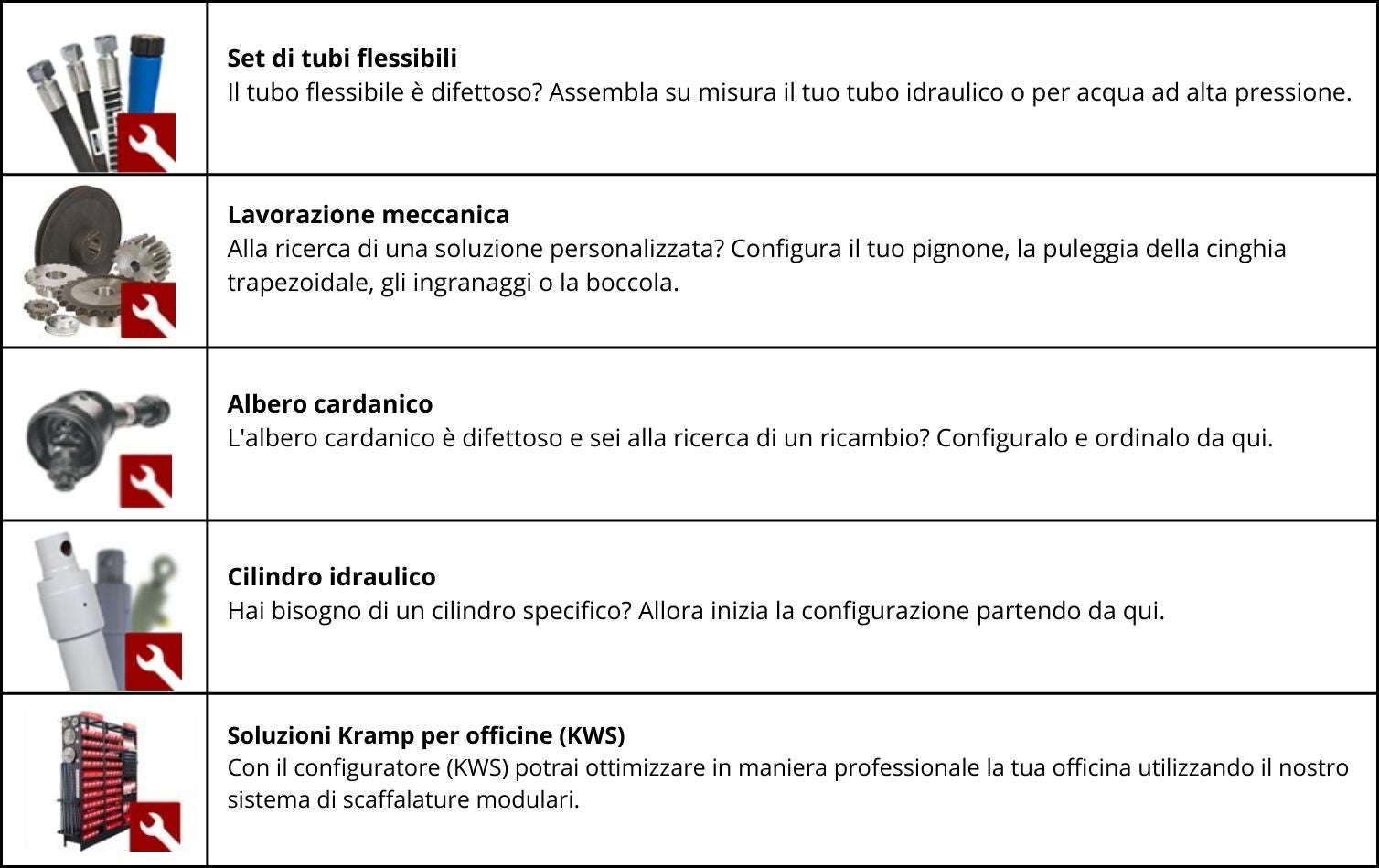 Effettuando il login sul sito web di Kramp www.kramp.com, si può accedere automaticamente al configuratore, che si trova in fondo alla pagina iniziale, alla voce Configuratore di Prodotto, nella categoria Servizi.