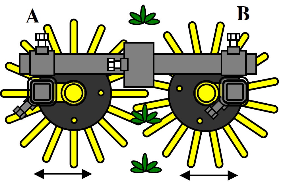 L'intensità dell'azione è regolata dalla distanza tra due dischi sarchiatori montati in parallelo (A e B).