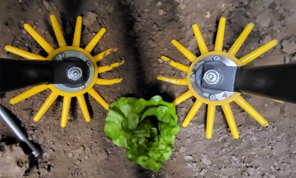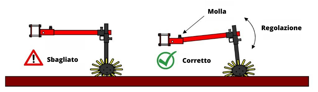 La pressione dei dischi sarchiatori sul terreno è un fattore essenziale: solo se il disco sarchiatore in posizione angolare viene premuto verso il terreno, le punte saranno piegate in senso contrario rispetto alla direzione di marcia. In questo modo si crea un cuscinetto di terreno tra le punte e la coltura e si aumenta la selettività dell'azione disinfestante.