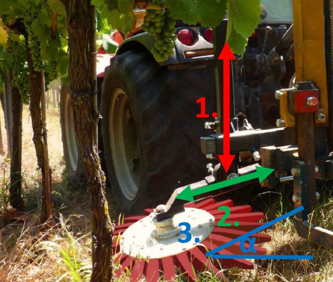 Con i modelli Maxi, l'intensità è legata alla pressione sul terreno (1), alla distanza tra le punte dei dischi e la fila di colture (2) e all'angolo tra la stella e la superficie del terreno (3).