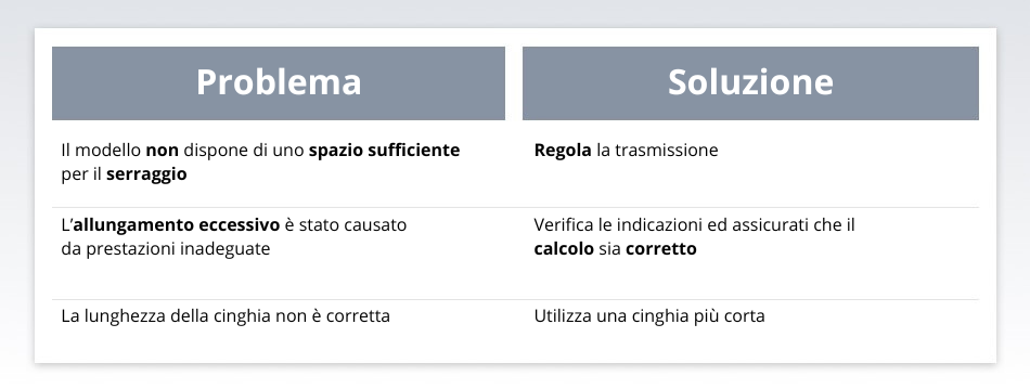 Se lo spazio a disposizione è insufficiente per motivi di progettazione, se l'allungamento estremo è stato causato da prestazioni inadeguate o se la lunghezza della cinghia trapezoidale non è corretta, non sarà possibile stringere ulteriormente le cinghie. La soluzione? Individua l'errore, determina la lunghezza corretta della cinghia trapezoidale e, se necessario, sostituiscila.