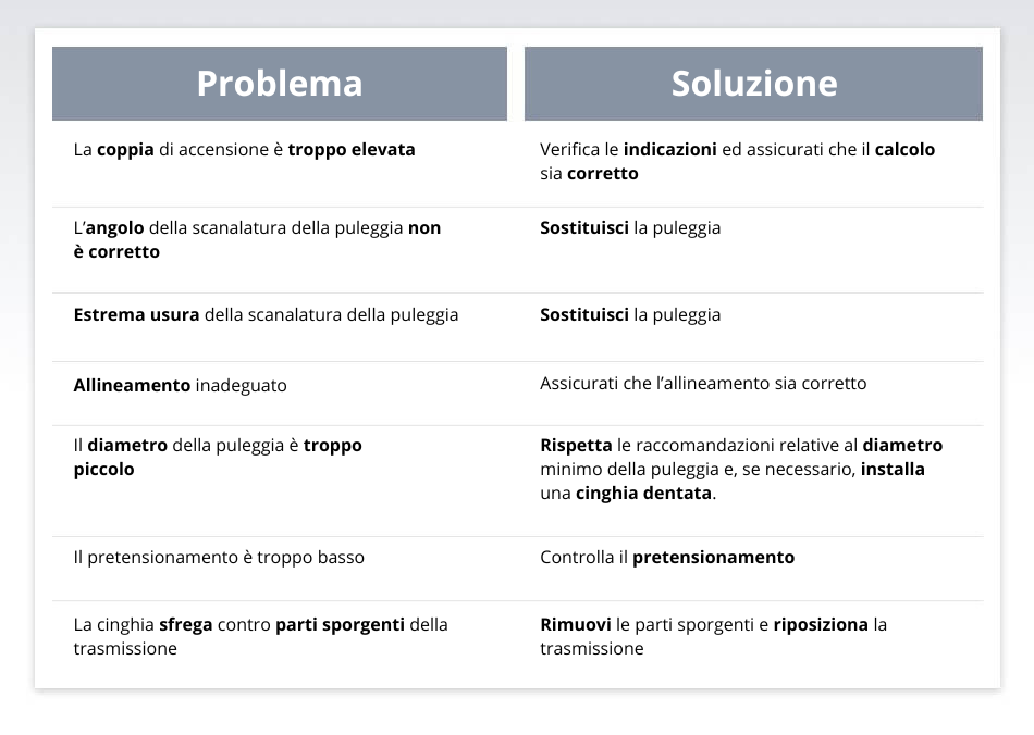 Problema n. 5: Cinghie trapezoidali che si invertono o fuoriescono dalla scanalatura