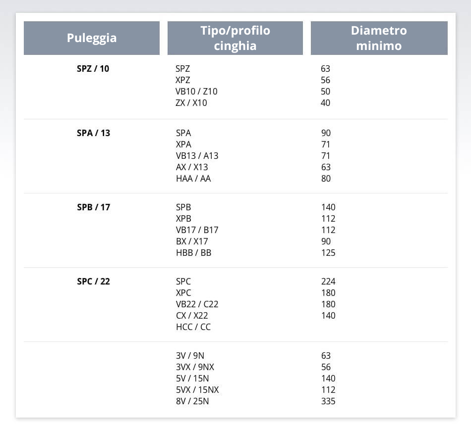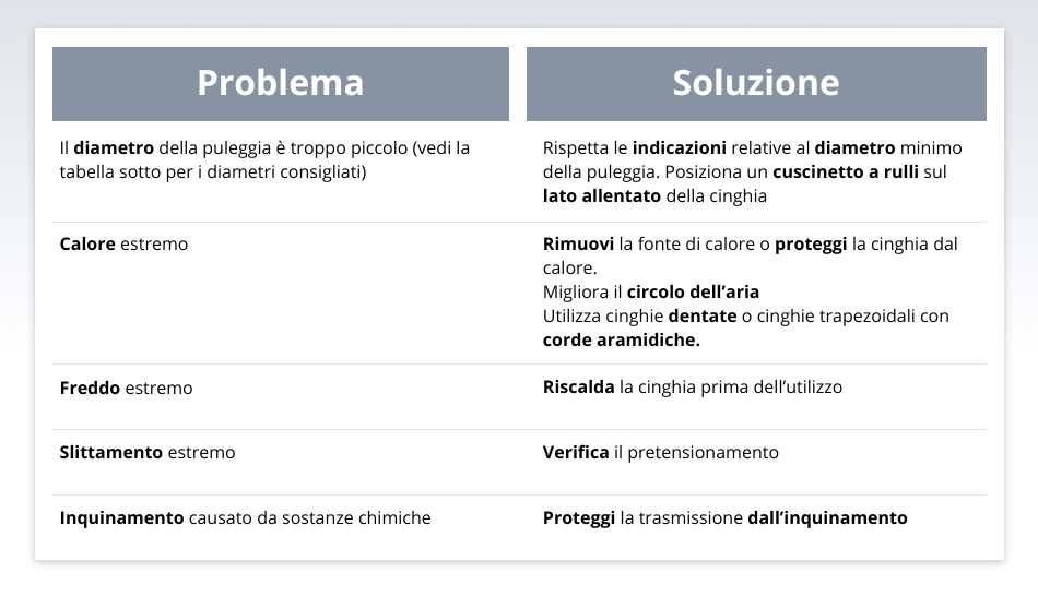 Le crepe si producono quando il diametro della puleggia è troppo piccolo (vedere la tabella seguente), in caso di contaminazione causata da sostanze chimiche (come indicato nella tabella seguente) o quando si verifica una delle seguenti condizioni: calore, freddo o slittamento estremi.