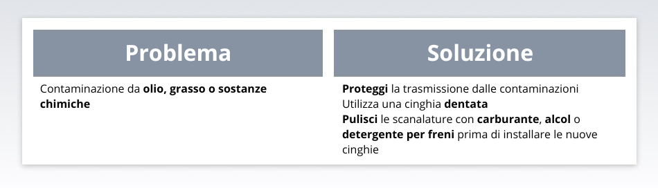 La contaminazione da olio, grasso o sostanze chimiche può provocare la dilatazione della cinghia trapezoidale o renderla molle e appiccicosa. Proteggila dalla contaminazione!