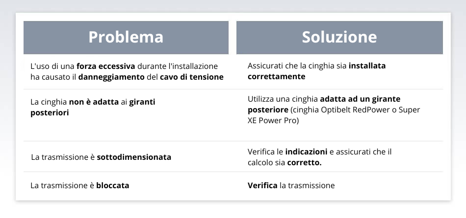Le ragioni che possono portare ad un'usura estrema sono numerose. Controlla ciascuno dei seguenti aspetti e, se necessario, installa una cinghia dentata o riposiziona la trasmissione.