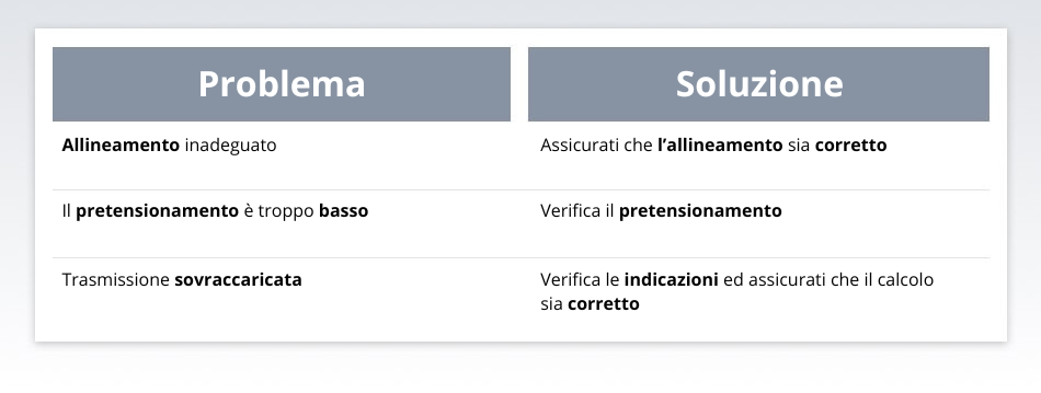 Rumori insoliti o estremamente forti possono verificarsi piuttosto spesso. Qualsiasi esperto potrà dirti che possono essere causati da un allineamento non corretto, da un pretensionamento insufficiente o da una trasmissione sotto eccessivo sforzo. Controlla i dati e le regolazioni e assicurati che i calcoli siano corretti: puoi farlo da solo oppure puoi richiedere l'assistenza di un esperto.