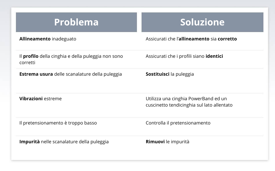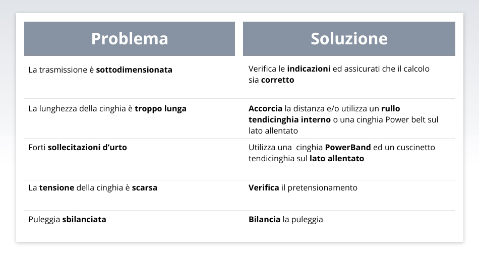 Le vibrazioni della cinghia possono essere dovute a diverse cause, tra cui trasmissione sottodimensionata, interasse tra gli alberi troppo elevato, carico d'urto elevato, tensione della cinghia troppo bassa o pulegge sbilanciate.