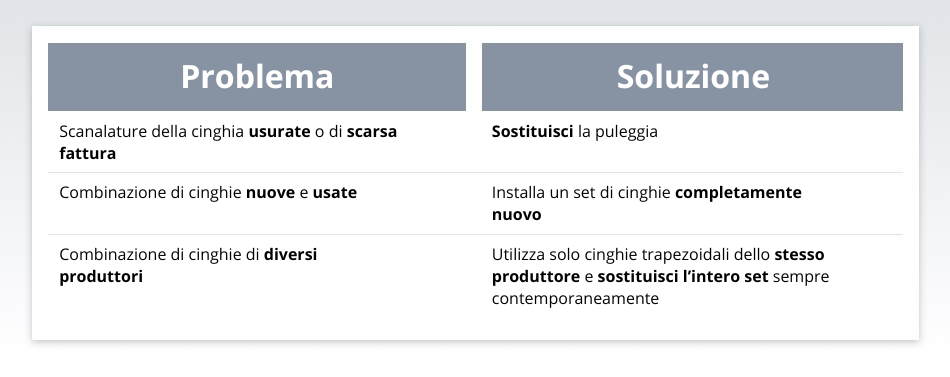 La soluzione? Installa sempre un set completo e nuovo di cinghie trapezoidali dello stesso produttore e dello stesso tipo. In questo modo eviterai qualsiasi tipo di problema!