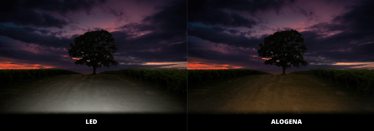 Nell'immagine sotto viene fatto un confronto tra una lampada da lavoro alogena (a destra) e una lampada da lavoro a LED (a sinistra) per il trattore.