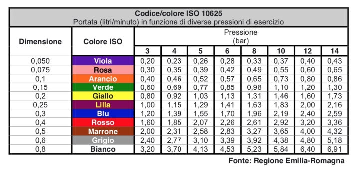 Trovi la tabella qui sotto, con l’avvertenza che, al momento, non tutti gli ugelli di tutti i costruttori seguono questa normativa. In alcuni casi si devono quindi usare tabelle di conversione, che mostrano le equivalenze tra il codice-colore ISO e quello del costruttore in questione.