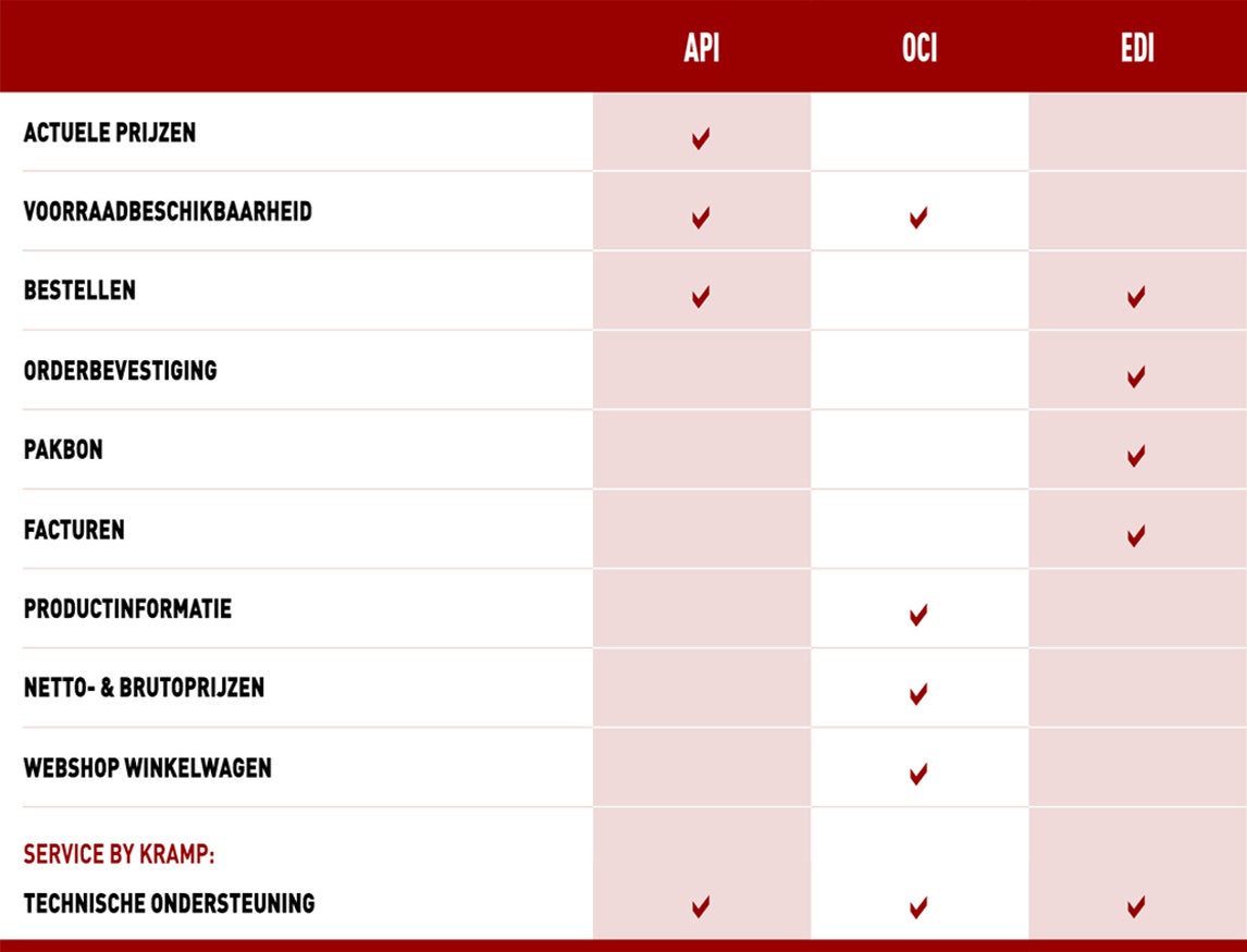 EDI: EDI (Electronic Data Interchange) Met EDI wordt het verwerken en verzenden van inkooporders is eenvoudig. Op het moment dat een inkooporder doet in uw bestelsysteem, kunt u deze met één druk op de knop via de EDI-verbinding naar Kramp versturen.