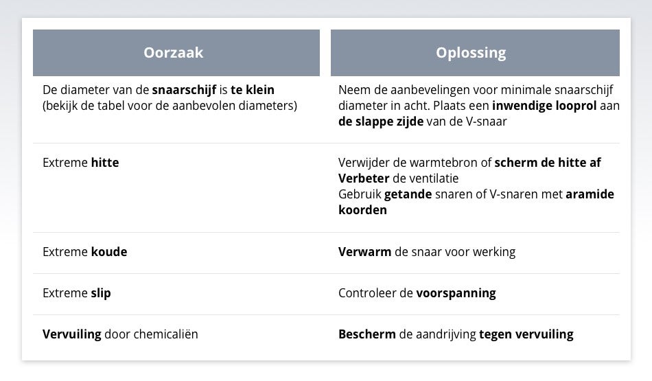 Breuken en barsten ontstaan als de diameter van de snaarschijf te klein is (zie tabel hieronder), vervuiling is ontstaan door chemicaliën of een van deze omstandigheden van toepassing zijn: extreme hitte, extreme kou of extreme slip.