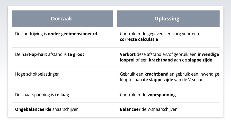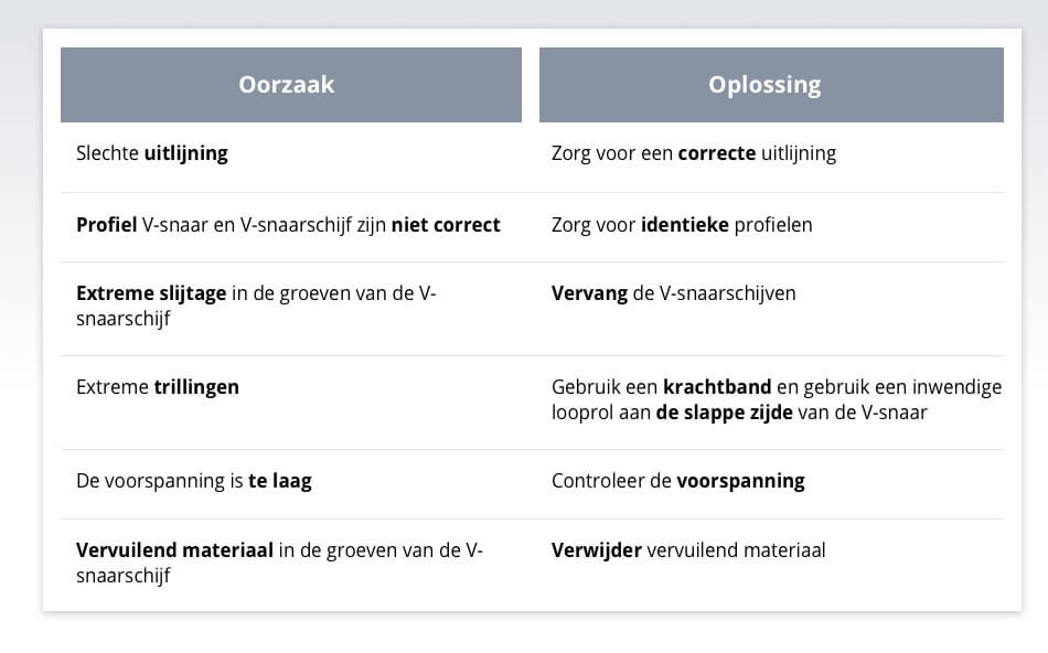 V-Snaren keren om door slechte uitlijning, extreme slijtage in de groeven van de V-Snaarschijf, extreme trillingen, een te lage voorspanning of vervuild materiaal in de groeven. Dit kan voorkomen worden door goed onderhoud.