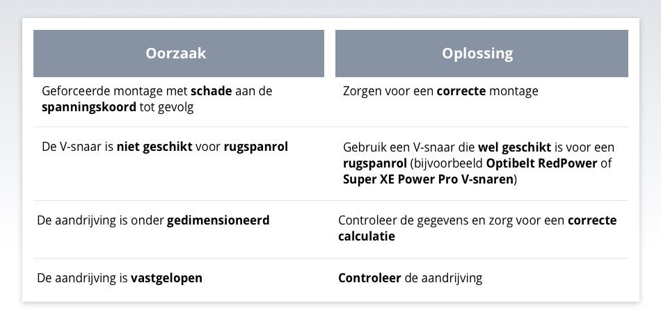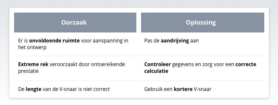 Als er onvoldoende ruimte in het ontwerp is, als er extreme rek is veroorzaakt door ontoereikende prestaties of als de lengte van de V-Snaar niet correct is, kunnen de snaren niet verder worden aangespannen. De oplossing? Ontdek waar de fout zit, bepaal wat de juiste lengtemaat is voor de V-Snaar en vervang de V-Snaar indien nodig.