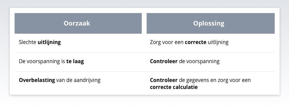 Er zijn tal van redenen waardoor extreme slijtage kan ontstaan. Controleer al deze zaken en plaats indien nodig een getande snaar of herpositioneer de aandrijving.