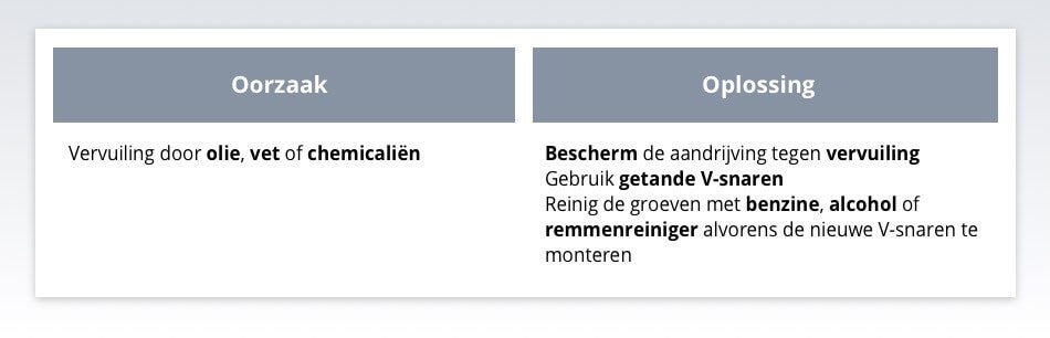 Door vervuiling door olie, vet of chemicaliën zwelt de V-Snaar op of wordt de riem zacht en kleverig. Bescherm de aandrijving tegen vervuiling.