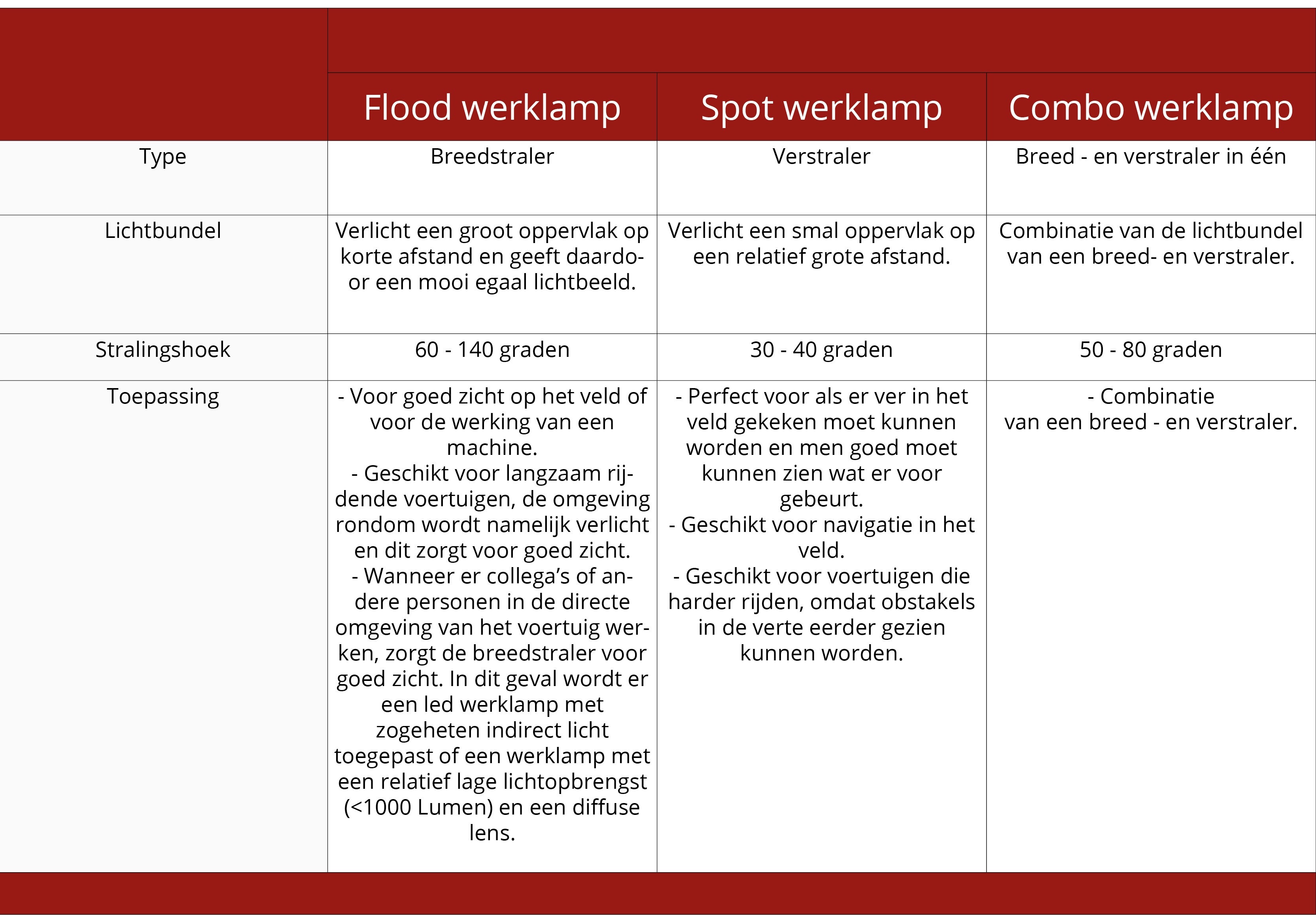 De combo werklampDe combo werklamp is een lichtbundel die beide combineert. De combo heeft een brede en een smalle lichtbundel waarbij de gebieden dichtbij en ver weg tegelijk worden verlicht.
