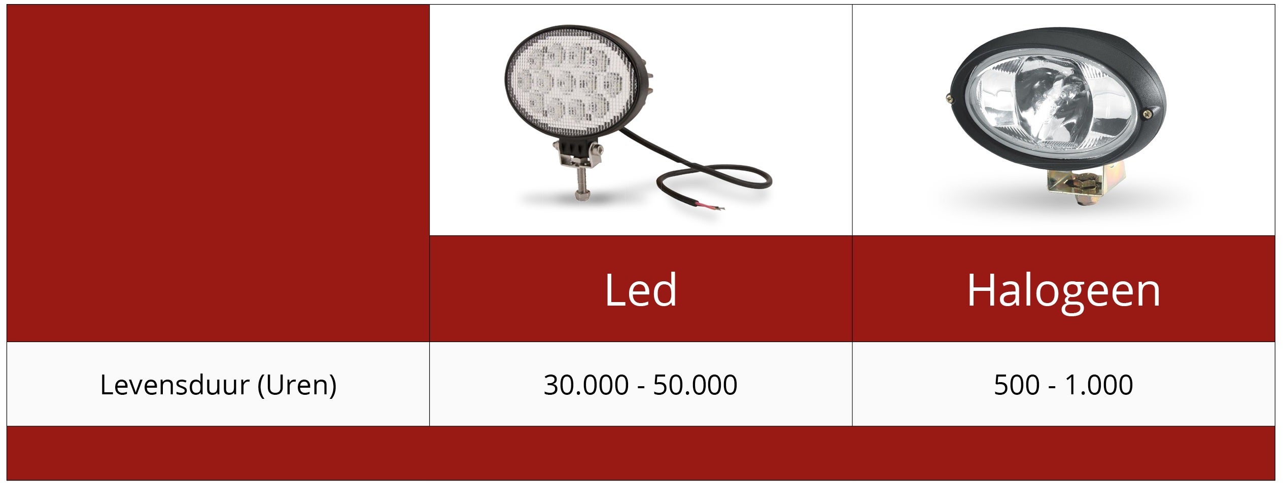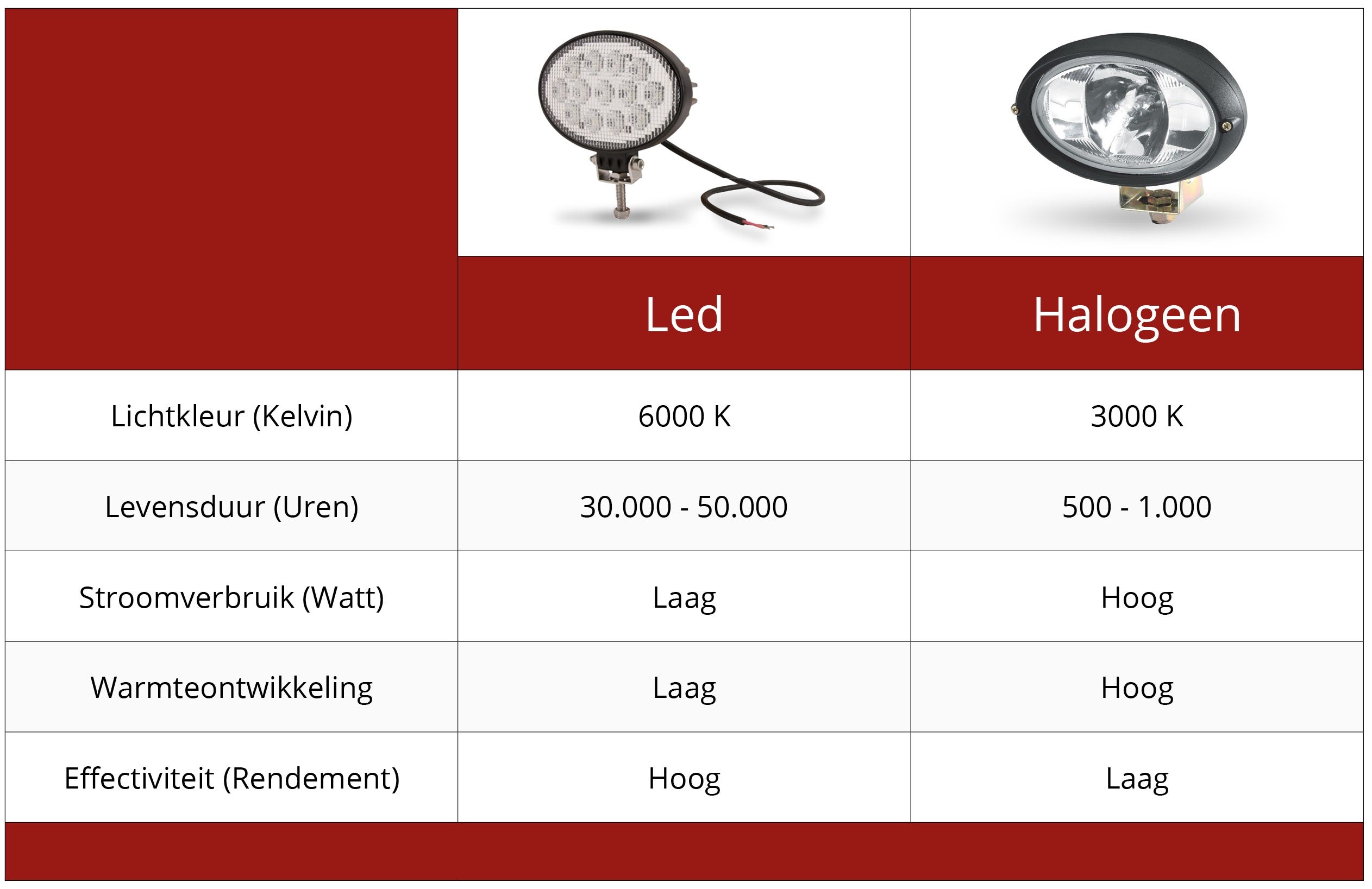 Ledlampen hebben het voordeel dat ze een hoge lichtopbrengst en een laag stroomverbruik hebben. Ten opzichte van de halogeen werklamp verbruikt de led werklamp relatief weinig stroom. Ook scoort ledverlichting beter op levensduur, rendement en lichtopbrengst. Het licht dat ledverlichting afgeeft is ook prettiger voor de ogen. Een ander verschil tussen led en halogeenlampen is dat een ledlamp langer meegaat.