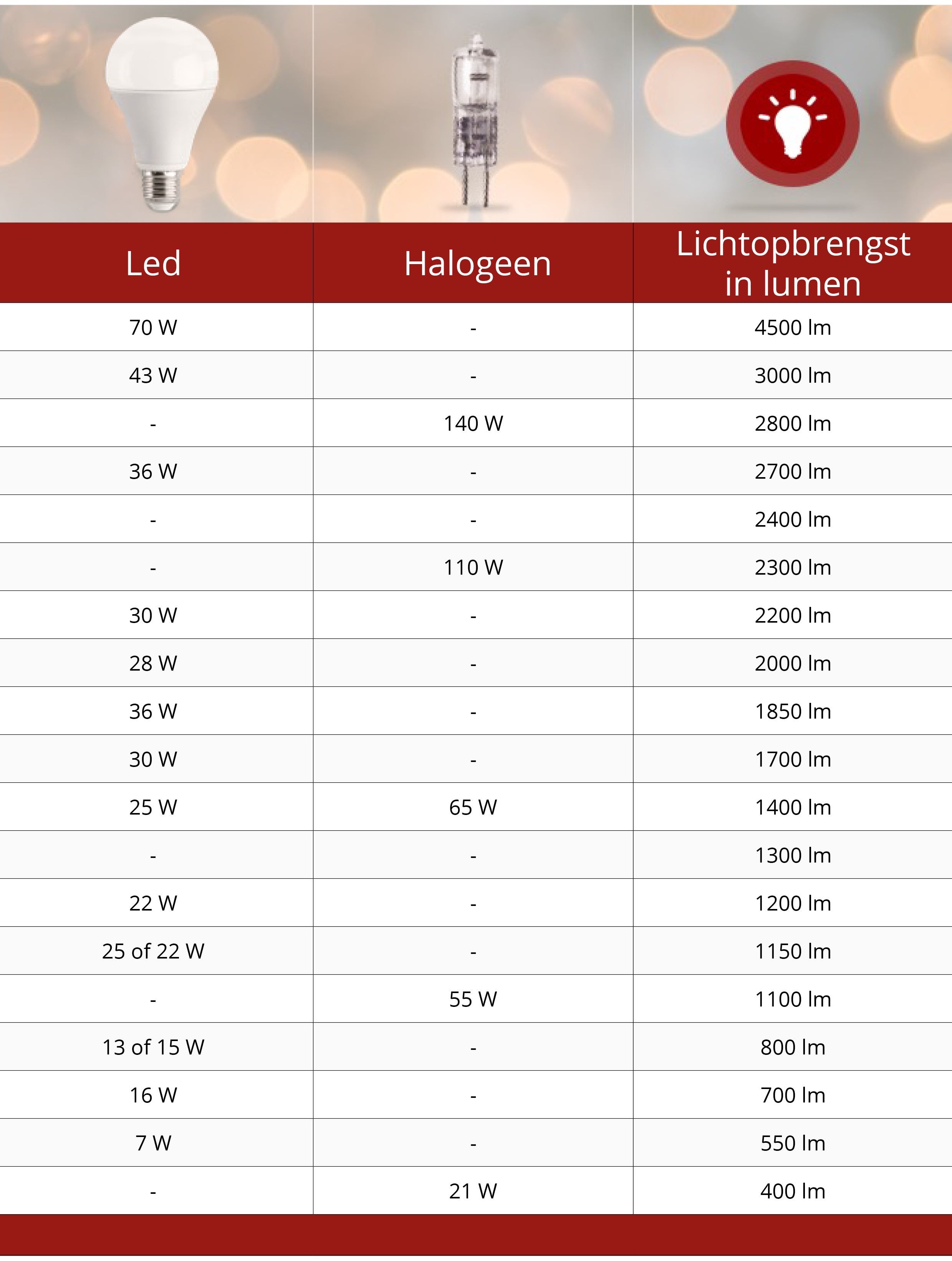 Door te kijken naar het aantal lumen, kunnen verschillende typen lampen met elkaar vergeleken worden. Het aantal lumen van een lamp zegt iets over de lichtopbrengst, terwijl watt iets zegt over het energieverbruik en het vermogen van een lamp. Lumen wordt ook gebruikt om de lichtsterkte per wattage uit te drukken. Een bepaald aantal lumen moet in verhouding gezien worden tot het aantal watt dat nodig is om de gewenste helderheid te bereiken. In onderstaande afbeelding wordt watt met lumen vergeleken.