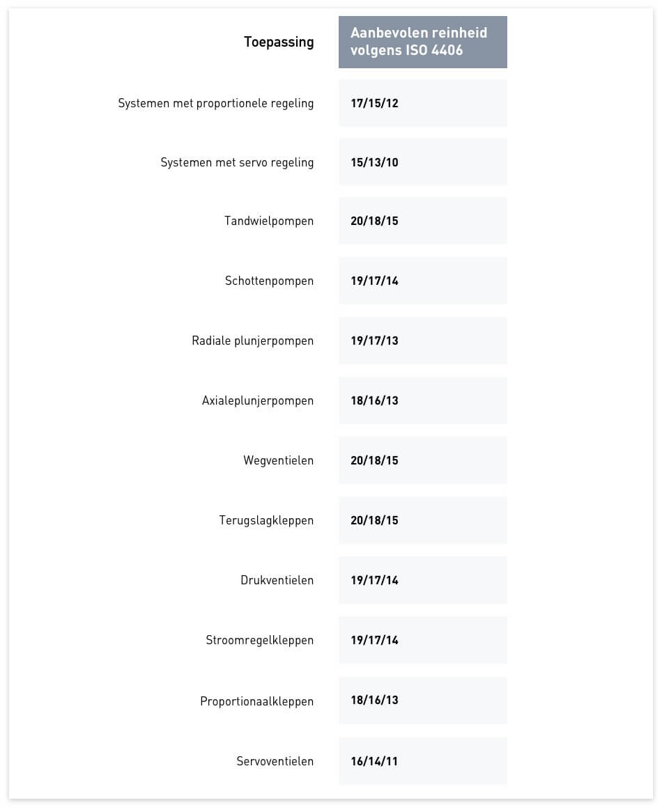 Door de nauwe spelingen die voorkomen in een hydraulisch systeem en vooral bij systemen met hoge drukken (200 bar) is de reinheid van de olie van groot belang. De gewenste reinheid hangt af van de componenten opbouw van het systeem: kleine spelingen behoeven een hogere reinheid. De meeste fabrikanten van hydraulisch componenten geven aan waar de reinheid van de olie aan moet voldoen. In onderstaande tabel zie je een globaal overzicht van de gewenste reinheid van diverse hydrauliek componenten.