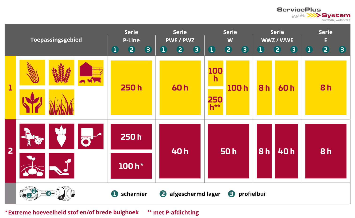 Het ServicePlus System kan uiteraard alleen worden toegepast op producten van Walterscheid. Zoals altijd moeten landbouwers die aftakassen van andere fabrikanten gebruiken, vertrouwen op advies dat zij hebben gekregen toen zij het onderdeel aanschaften.