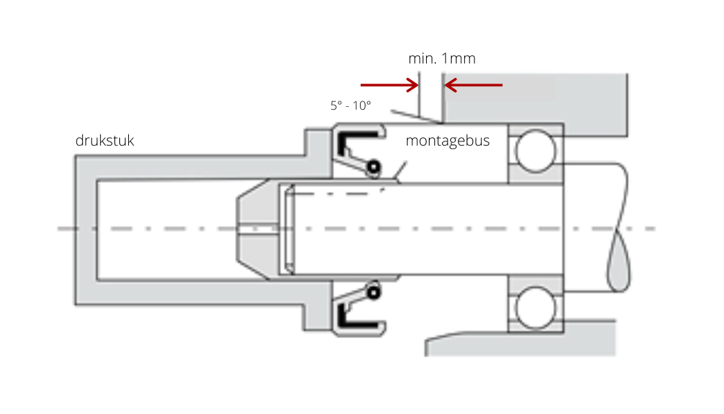 Wat is het allerbelangrijkste? Houd de cilinders, boring en as goed schoon. Viezigheid tussen de afdichtingslip en as zorgt voor een lekkage. Daarnaast moet de binnendiameter van de oliekeerring bij een montage worden opgerekt. Hierbij is het belangrijk dat de as een oploopkant heeft in een hoek van 30° tot 50°. Ook voor de boring geldt dat er een minimale afschuining van 30° moet zijn aan de oploopzijde. Dat zie je op deze afbeelding: