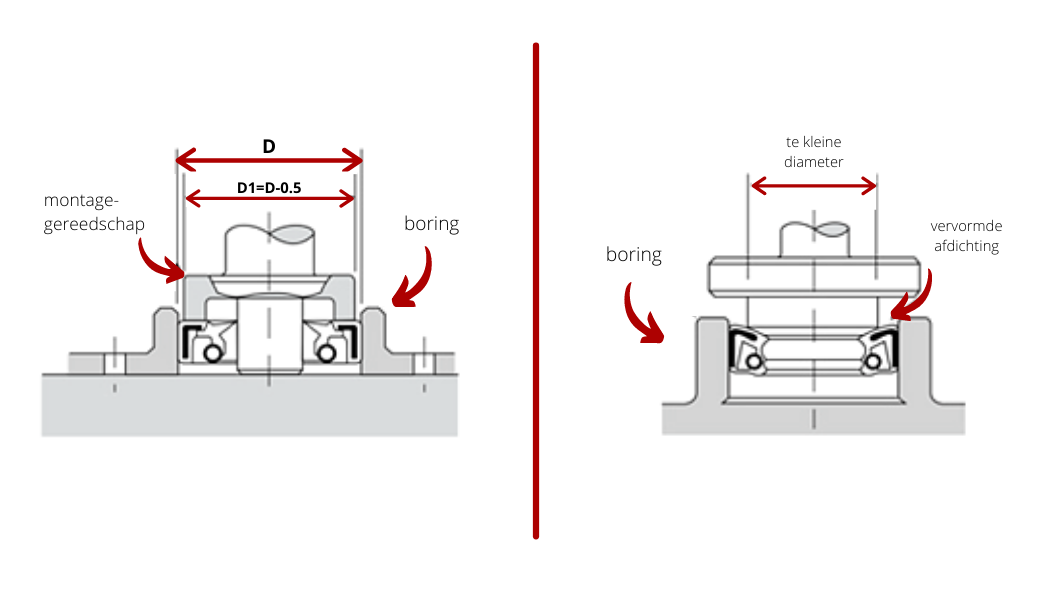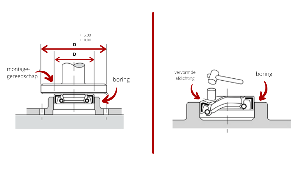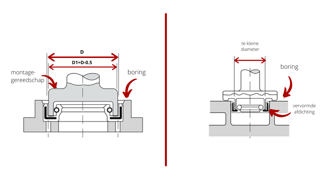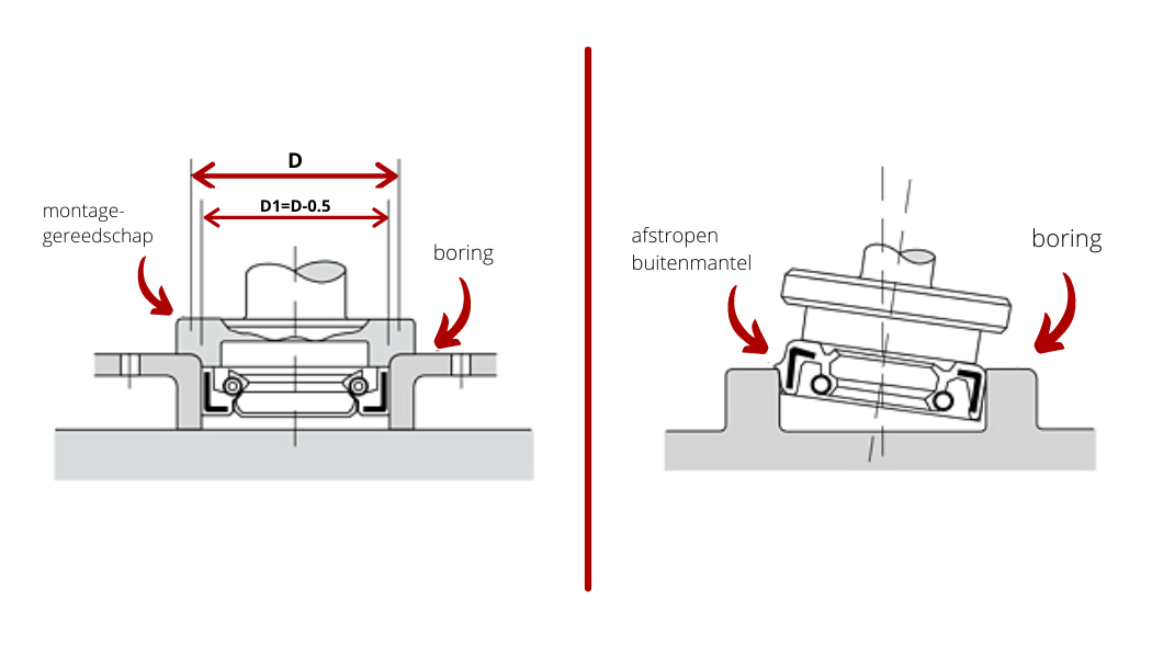 Gebruik niet te veel kracht bij het plaatsen van oliekeerring in de boring. Zorg voor een aangepaste montagetool en druk de oliekeerring voorzichtig in de boring.