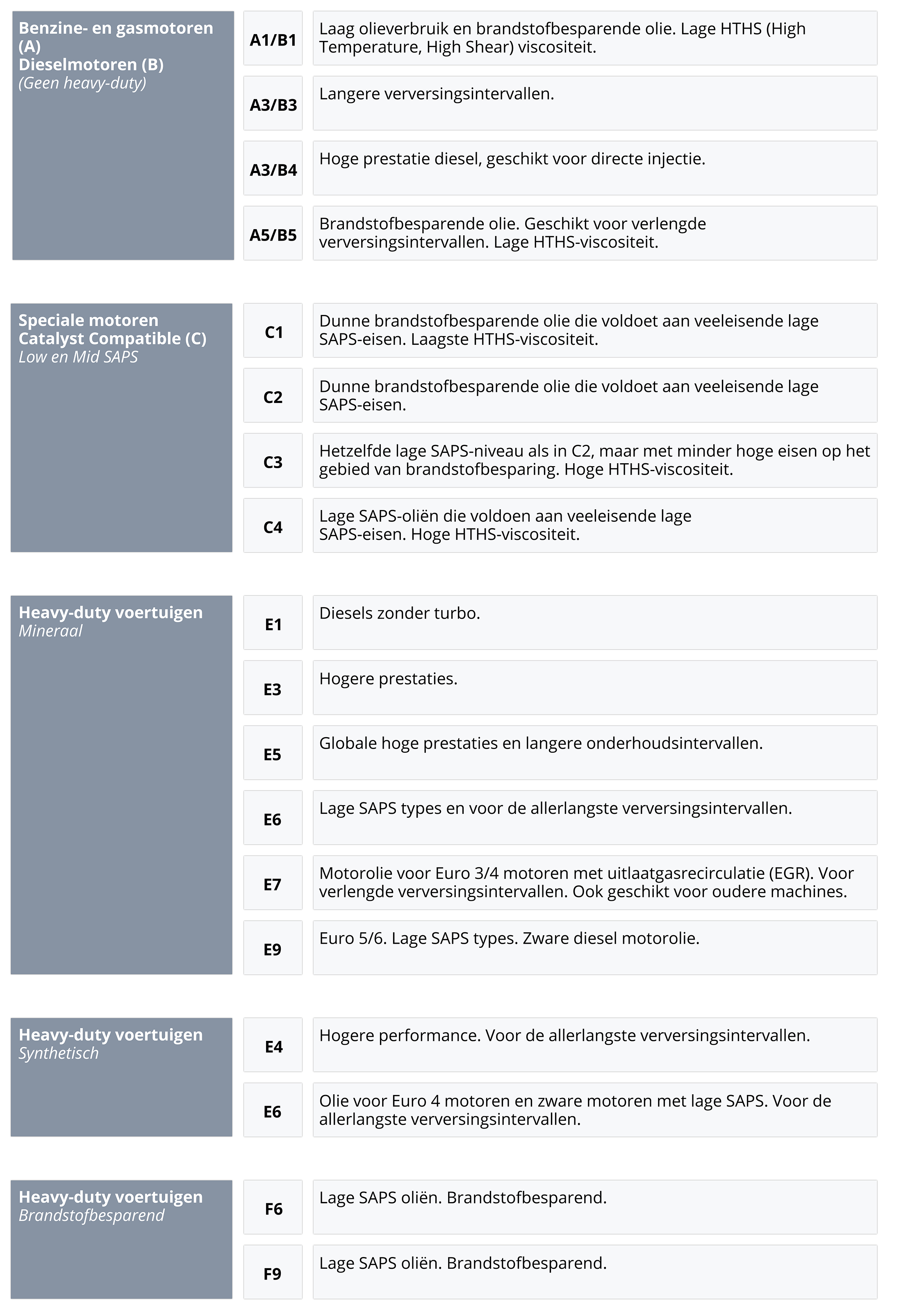 Een belangrijke specificatie is ACEA. Deze bestaat uit één letter en één cijfer. Bij deze specificatie wordt het volgende onderscheid gemaakt: