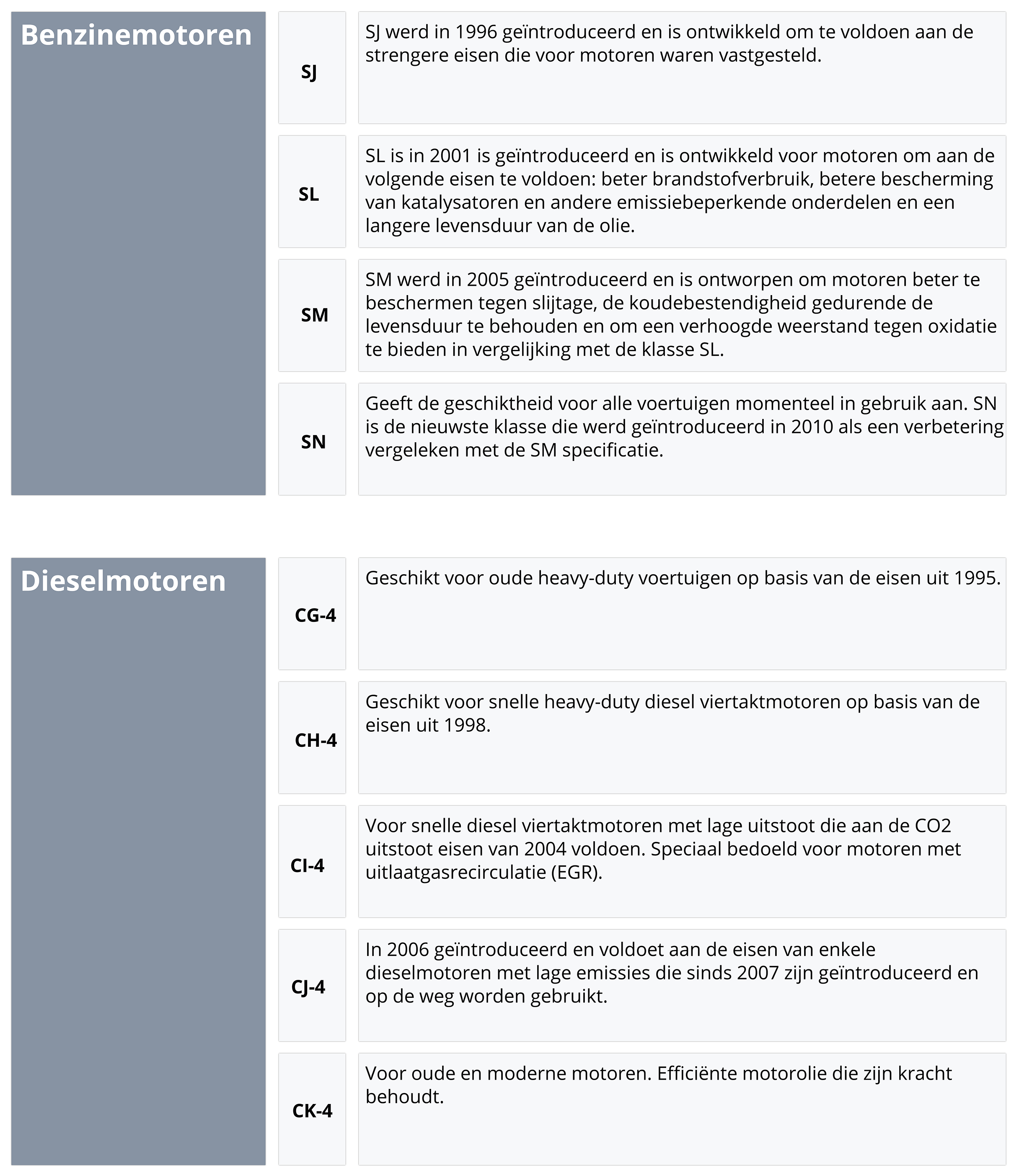 - Onder de letter ‘C’ vallen de categorieën van diesel motorolie