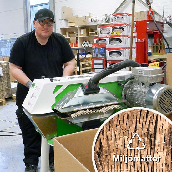 Vi bruker 100 % resirkulert papir for å pakke våre leveranser. Vi forsegler pallene våre med tynnere plastfilm ved å bruke en maskin for å strekke plasten. Dette reduserer avfallet. Vi gjenbruker gamle kartonger og bølgepappesker med en effektiv bølgekvern som blir miljøtepper. Miljømatten har høy støtdempende kapasitet og er veldig fleksibel når vi pakker varer. De er miljøvennlige og kan erstatte eller komplementere bruk av luftputer, bobleplast og andre typer emballasjemateriale Vi har byttet ut plastposer med slitesterke papirposer.