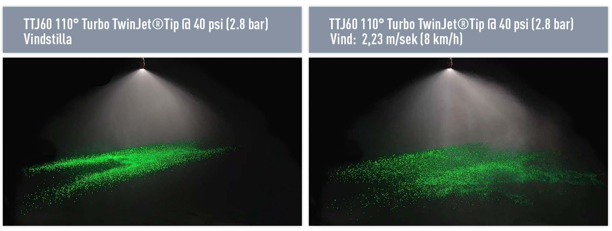 Med riktig type TeeJet-dyse er det mulig å oppnå 90 prosent avdriftsreduksjon. Dyser med lavt avdrift er klassifisert i 50 %, 75 %, 90 % og 95 % avdriftsreduksjon. Driften avhenger av type dyse og trykket som brukes med dysen. Ved å senke trykket kan man i noen tilfeller oppnå høyere avdriftsreduksjon med samme dyse. Eksempel: TeeJet-dyse TTI60 ved 4,5 bar reduserer drift med 50 %. Samme dyse ved 2 bar gir 75 % driftsreduksjon og ved 3 bar 90 % reduksjon. Det er ikke mulig å bruke hvilken dyse man ønsker i hver enkelt situasjon. Det kan variere fra land til land. Sjekk om det er noen restriksjoner på bruken din.