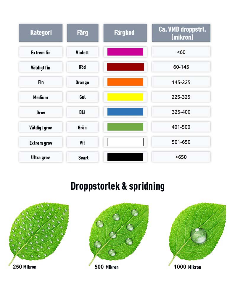 Hvordan velger jeg riktig dyse for å redusere avdrift? Vi gir deg en oversikt over mulighetene i tabellen nedenfor.