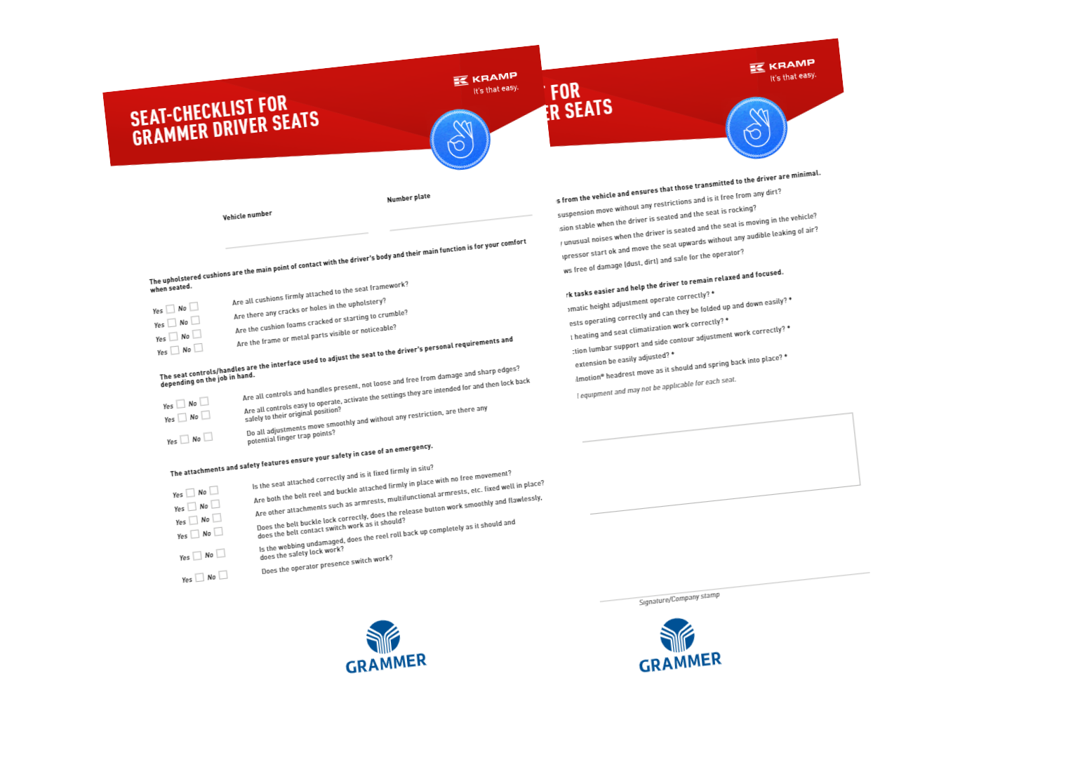 Lista kontrolna firmy Grammer do foteli wskazuje Tobie i Twoim klientom, na co dokładnie należy zwrócić uwagę podczas przeglądu foteli w kabinie, dzięki czemu możesz utrzymać je w możliwie najlepszym standardzie.